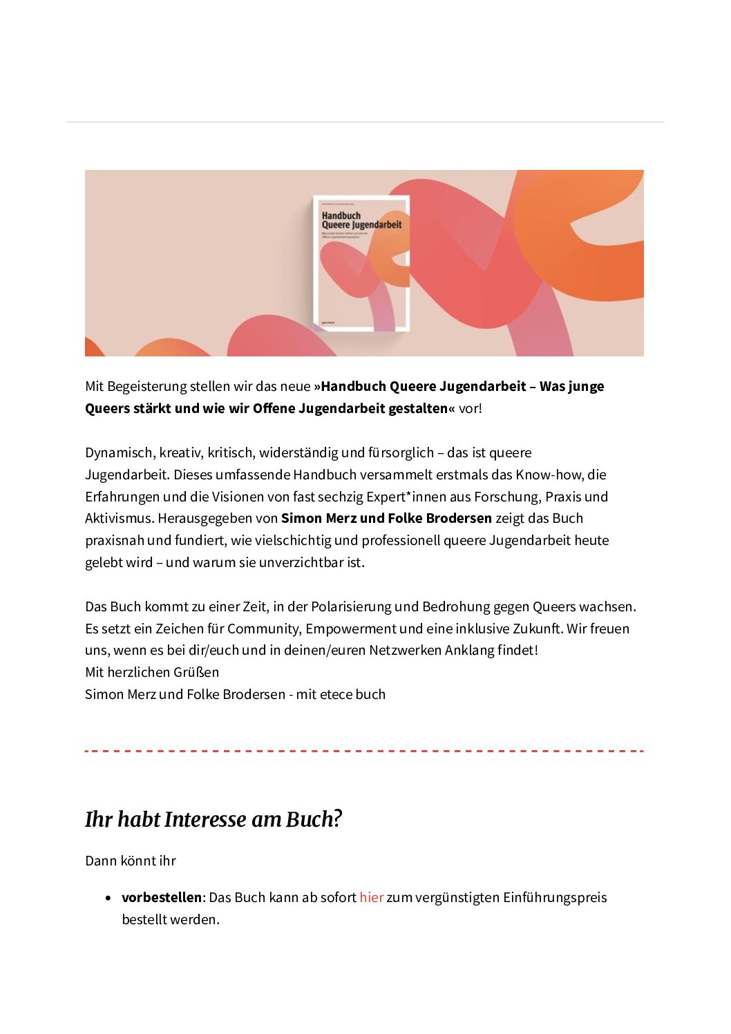Dynamisch, kreativ, kritisch, widerständig und fürsorglich – das ist queere Jugendarbeit. Dieses umfassende Handbuch versammelt erstmals das Know-how, die Erfahrungen und die Visionen von fast sechzig Expert*innen aus Forschung, Praxis und Aktivismus. Herausgegeben von Simon Merz und mir zeigt das Buch praxisnah und fundiert, wie vielschichtig und professionell queere Jugendarbeit heute gelebt wird – und warum sie unverzichtbar ist.